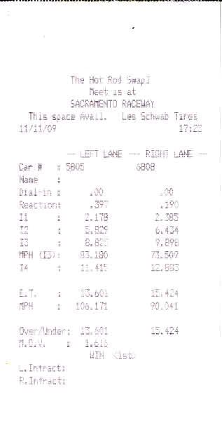 Yeah Im gonna try to get a pic up of it tonight. Sorry I have been at work. It will be up in a little bit.Gary, is there any way you can scan your time slip and post it?